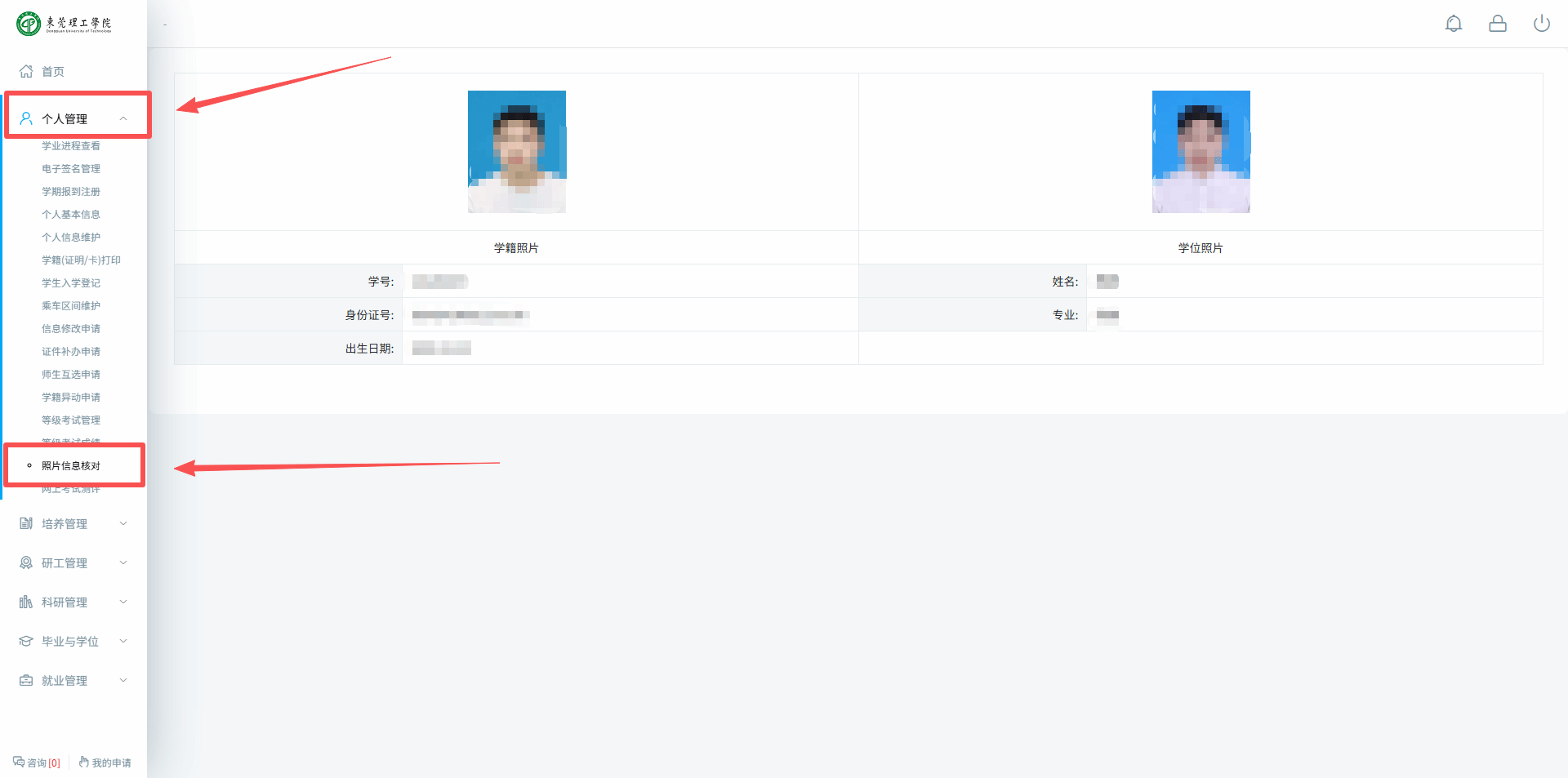 2.点击:“个人管理”-“照片信息核对”,核对录取与学历照片的一致性,若有误或缺失,请联系所在学院秘书,以学院为单位进行反馈。