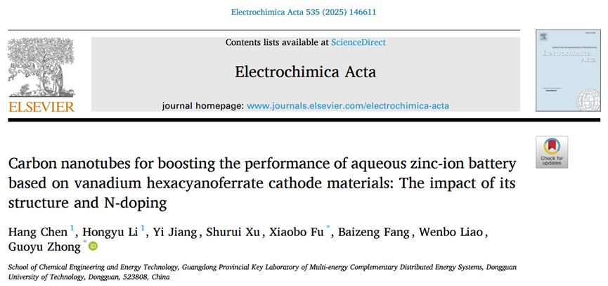 2023级能源动力硕士研究生李宏宇以共同第一作者在国际知名期刊《Electrochimica Acta》(中科院2区)上发表题为“Carbon nanotubes for boosting the performance of aqueous zinc-ion battery based on vanadium hexacyanoferrate cathode materials: The impact of its structure and N-doping ” 创新研究成果,陈航博士为共同第一作者,傅小波教授和钟国玉副教授为共同通讯作者,东莞理工学院为第一完成单位。研究团队创新性地将铁氰化钒与不同结构的碳纳米管复合,探究了碳纳米管的氮掺杂特性与结构特征在提升铁氰化钒基水溶液锌离子电池性能中的关键作用。电池测试结果显示,引入碳纳米管可有效提升电极材料的比容量与循环稳定性。机理分析进一步表明,氮掺杂有助于增强充放电反应动力学过程,从而提高比容量;而竹节状与鱼骨状结构不仅能提供额外的机械支撑,也为Zn²⁺嵌入提供了更多活性位点,有利于提高电池比容量,同时延长循环使用寿命。该研究为开发柔性水系锌离子电池的碳基正极材料设计提供了重要的材料支持和理论依据。